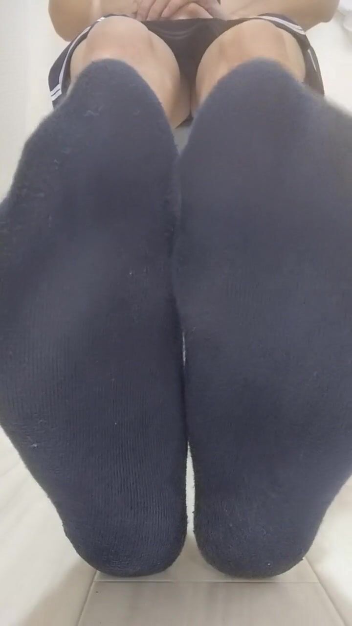 ミニスカ女装男子が紺色の靴下を履いた足裏を見せつける!